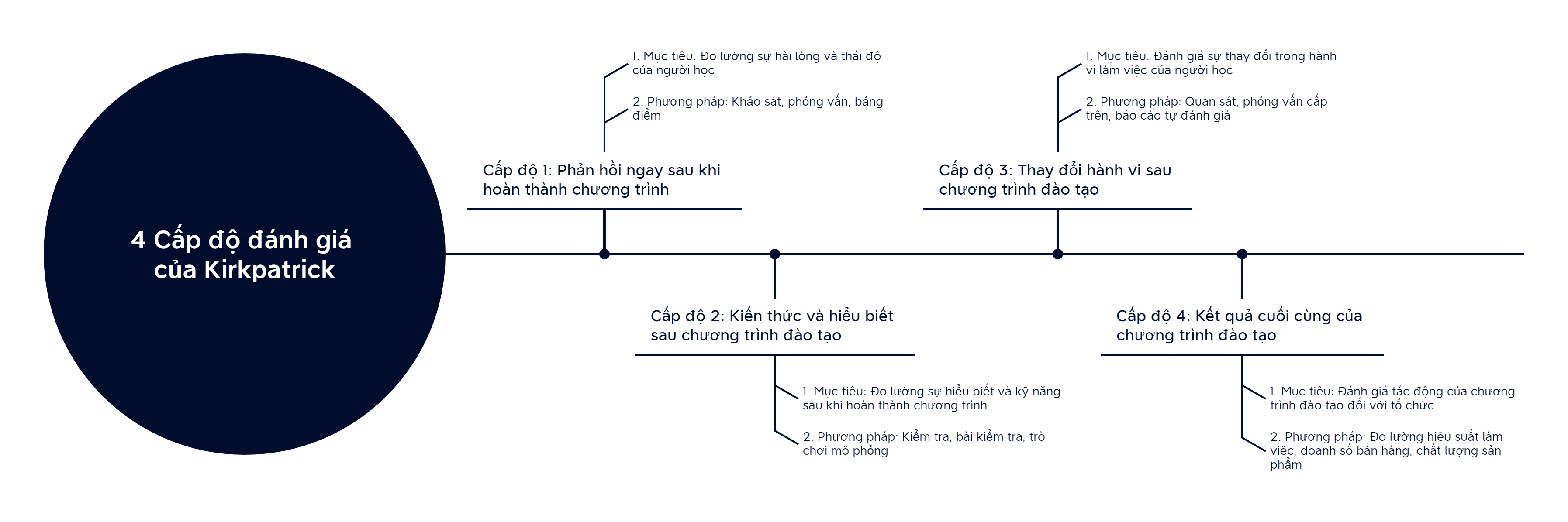 # Mô hình đánh giá đào tạo bốn cấp độ của Kirkpatrick là một phương pháp phổ biến được sử dụng để đánh giá hiệu quả của các chương trình đào tạo. Mỗi cấp độ đều có các tiêu chí và phương pháp đánh giá riêng để đo lường sự thành công của chương trình đào tạo. Bốn cấp độ bao gồm: