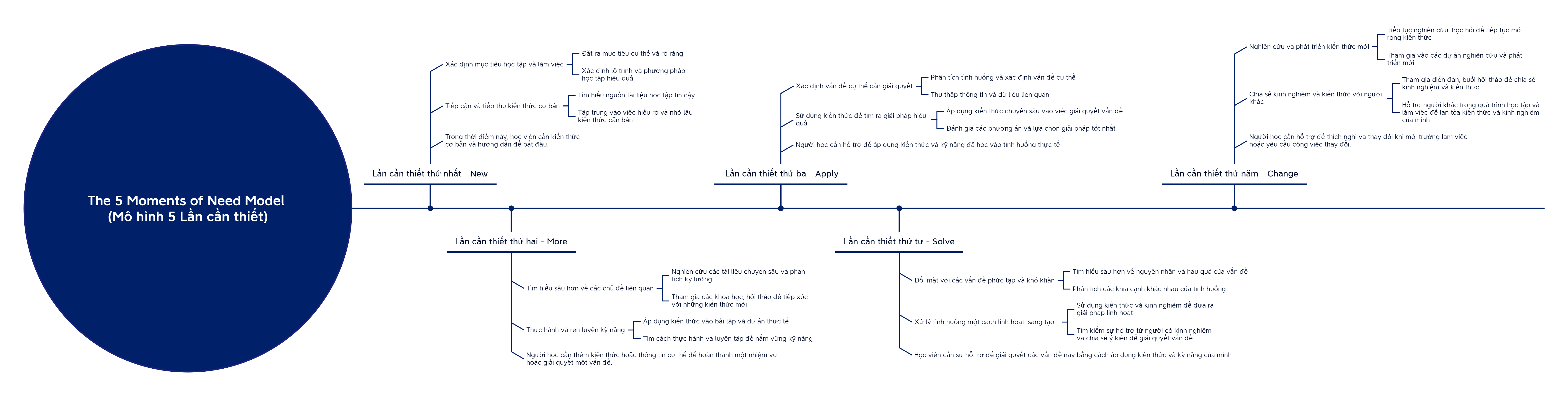 Mô hình "5 Moments of Need" (5 Lần cần thiết) được phát triển bởi Bob Mosher và Conrad Gottfredson là một khung nhận biết năm tình huống chính mà người học cần hỗ trợ học tập và thực hành kiến thức. Dưới đây là mô tả của mỗi "Lần cần thiết":