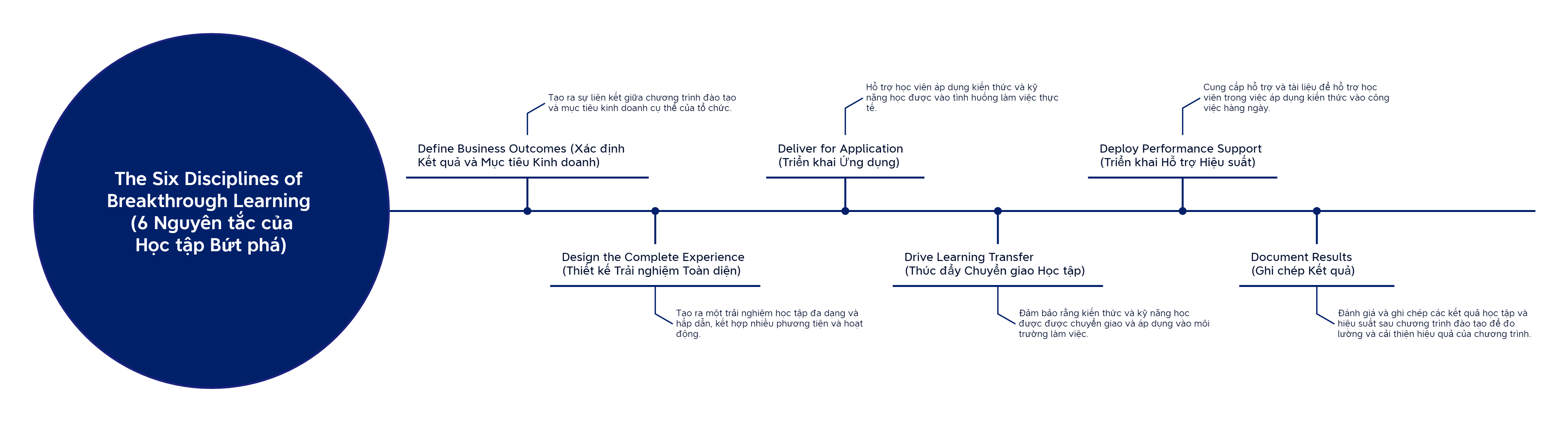 # "Sáu nguyên tắc của Học tập Bứt phá" là một mô hình tập trung vào việc tạo ra các chương trình đào tạo hiệu quả và mang lại những bứt phá trong việc phát triển kỹ năng và hiệu suất làm việc của học viên. Dưới đây là sáu kỷ luật chính của mô hình: