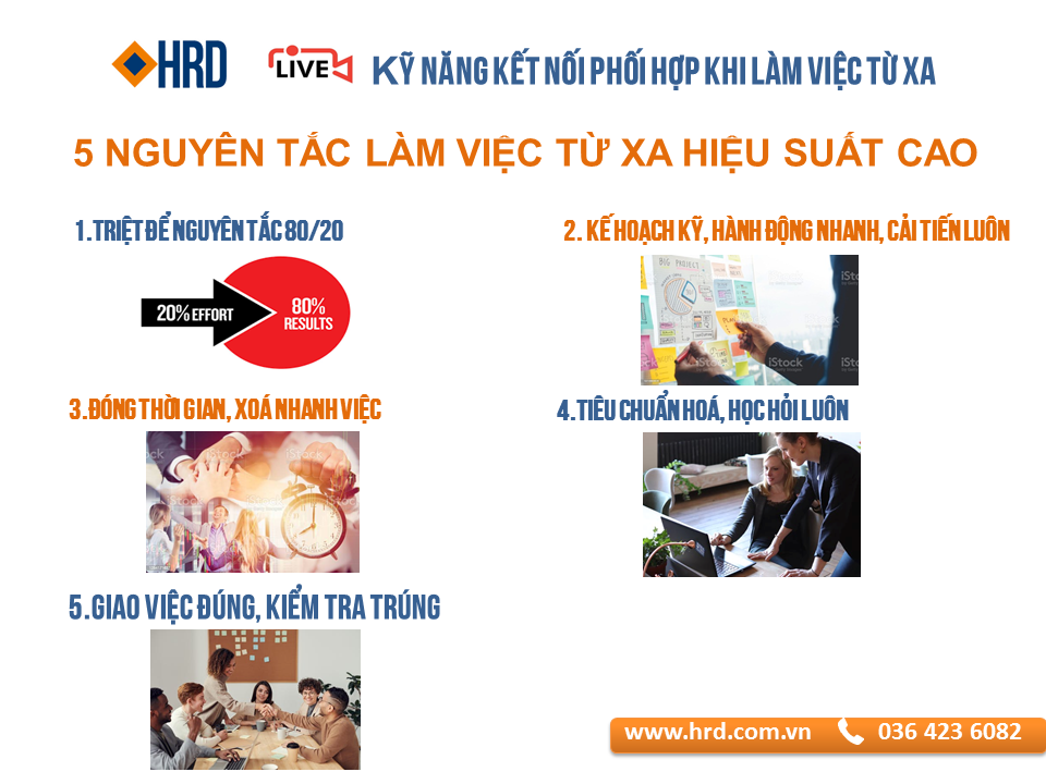Giao việc từ xa: Làm việc từ xa cần tối ưu thời gian trao đổi công việc. Quản lý/Team Leader giao việc thì phải nói rõ mục tiêu (Why): Muốn gì, Kết quả mong đợi như thế nào. Cái này là để người nhận hiểu được cái bức tranh lớn, mục tiêu là gì. Để nhân viên rõ: Việc được giao là một mắt xích trong cả hệ thống. Mắt xích đó chậm, hỏng là hỏng chậm cả hệ thống. Sau khi làm rõ WHY mới đi vào cụ thể cần làm gì (What), và khi nào xong (When). Phương pháp làm (How) thì tuỳ vào năng lực người nhận việc mà giao việc cho tương xứng.