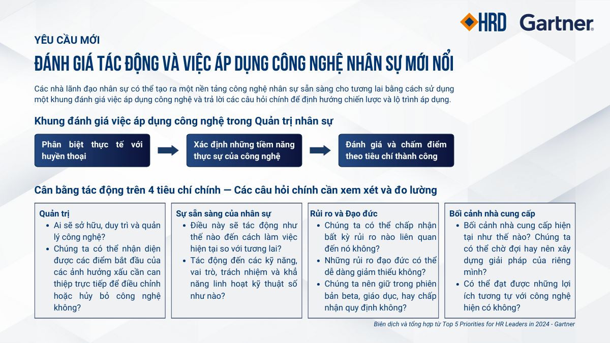 3. Công nghệ trong nhân sự: Giám đốc nhân sự đang đối mặt với thách thức trong việc áp dụng công nghệ mới, đặc biệt là AI. Họ cần đánh giá và triển khai công nghệ nhân sự một cách linh hoạt và hiệu quả để đáp ứng nhu cầu kinh doanh hiện tại và tương lai.