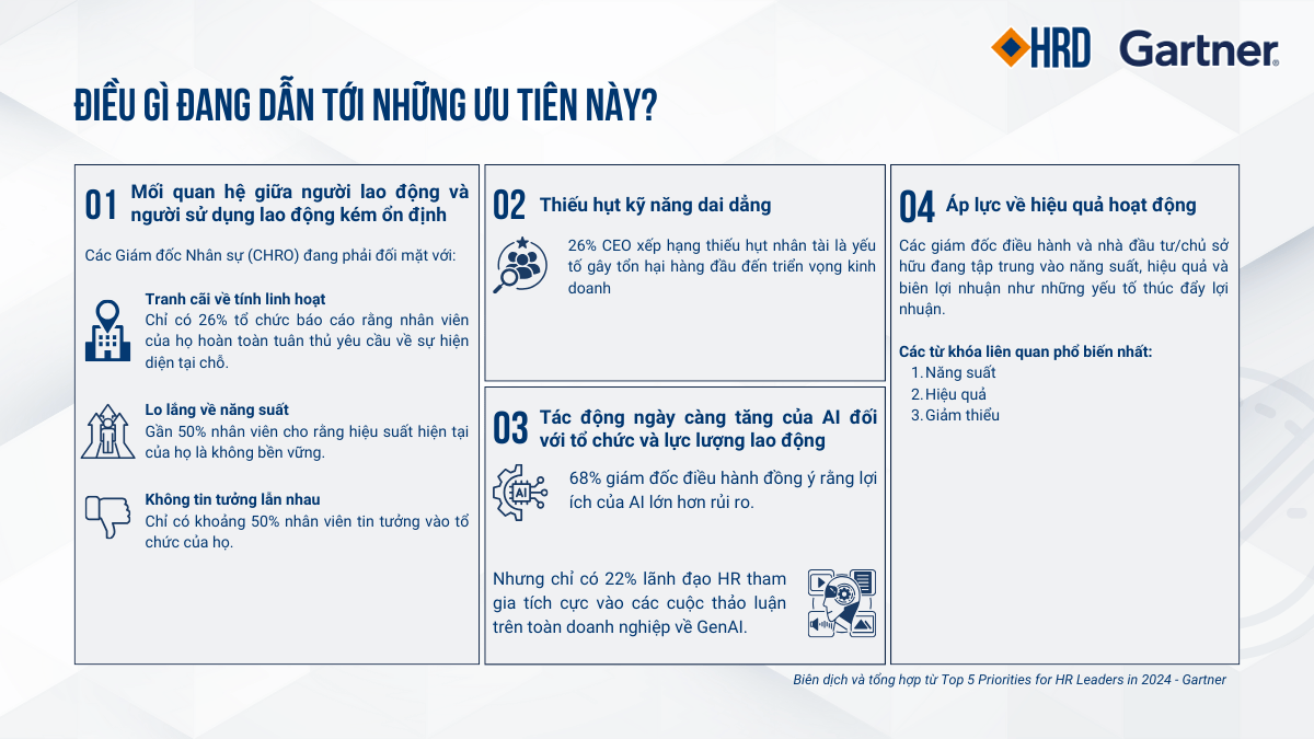 Báo cáo cũng chỉ ra rằng sự thiếu kỹ năng liên tục và tác động ngày càng tăng của AI đối với doanh nghiệp và lực lượng lao động là những yếu tố then chốt ảnh hưởng tới sự ưu tiên của các CHRO. Mặc dù lợi ích của AI được công nhận rộng rãi, chỉ có một tỷ lệ nhỏ Giám đốc, Quản lý nhân sự tích cực tham gia vào các cuộc thảo luận về AI, điều này cho thấy cần có sự thay đổi trong cách tiếp cận và đào tạo ứng dụng AI vào trong công việc.