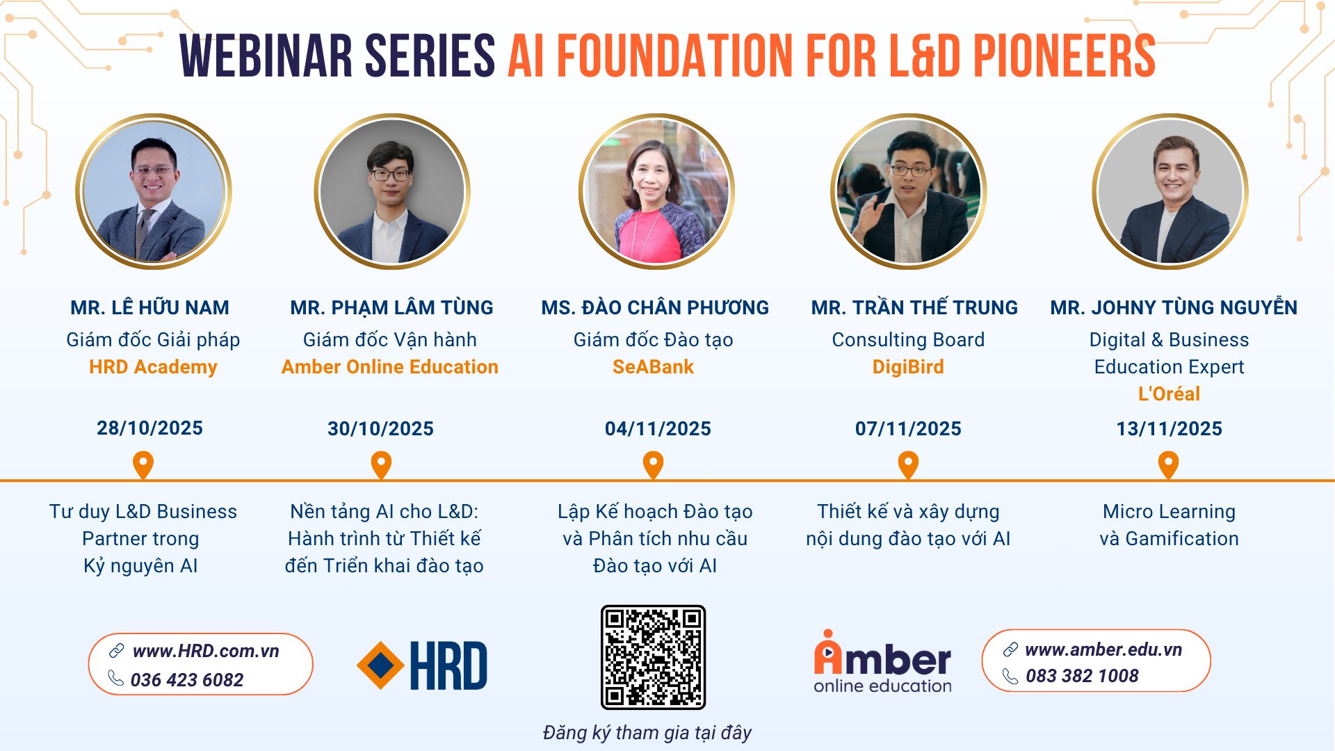 Đó chính là lý do HRD Academy phối hợp cùng Amber Online Education tổ chức chuỗi Webinar AI Foundation For L&D Pioneers. Chương trình diễn ra trong 5 buổi từ 28/10 - 13/11 với sự tham gia chia sẻ trực tiếp từ các L&D Manager/Director có kinh nghiệm chuyên sâu & thực tiễn tại các Doanh nghiệp hàng đầu Việt Nam.