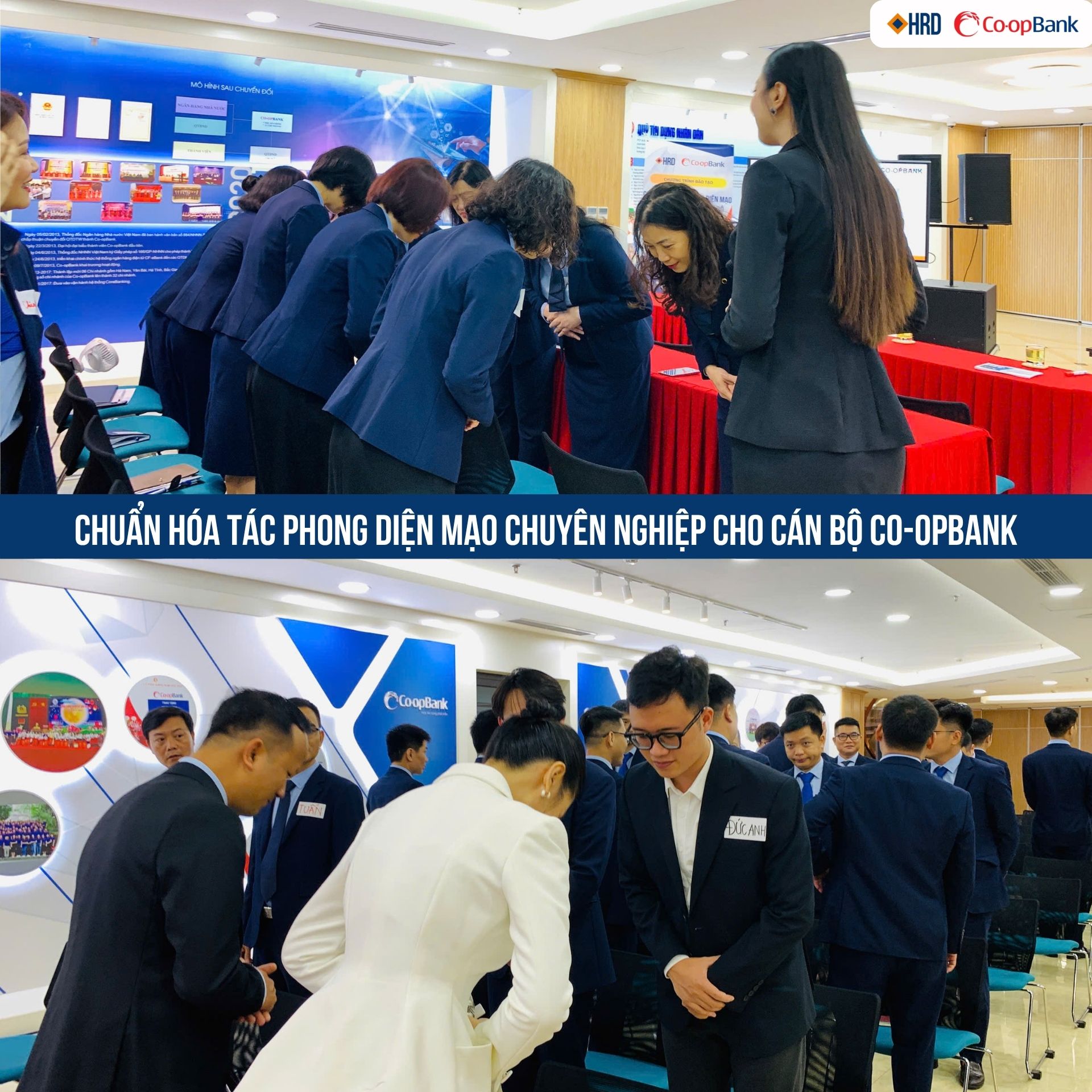 Các cán bộ của #Co-opBank đang cùng chuyên gia #HRDAcademy rèn luyện từng cử chỉ, từng hành động để chuẩn hóa tác phong và diện mạo chuyên nghiệp, từ bên trong ra bên ngoài.