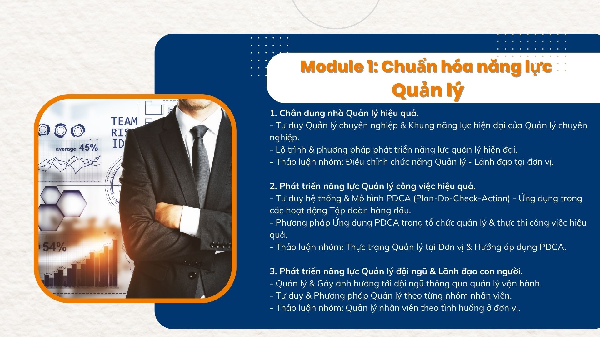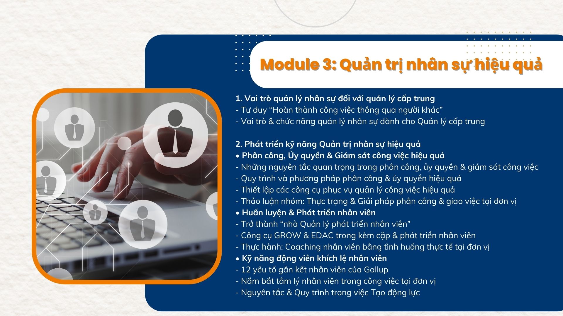 Vậy làm thế nào để nâng cao năng lực của đội ngũ này, hãy tham khảo ngay chuỗi chương trình “Nâng cao năng lực đội ngũ Quản lý - Lãnh đạo cấp trung” với 3 Module chính: