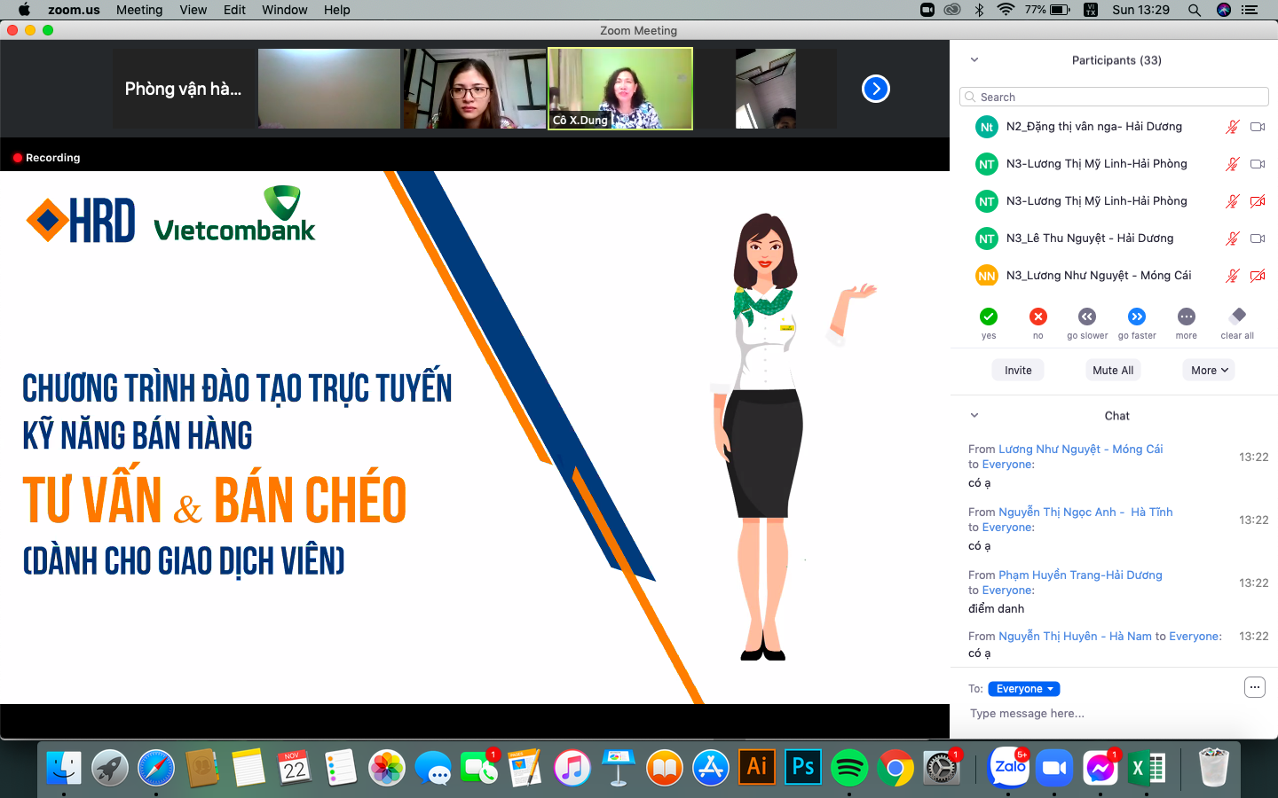 Khóa học đã diễn ra hết sức sôi nổi & hấp dẫn. Giảng viên của HRD Academy đã trực tiếp chia sẻ rất nhiều kinh nghiệm quý báu bán hàng tư vấn, bán hàng chéo, và đóng vai làm Giao dịch viên tại quầy Vietcombank. Các học viên cũng rất nhiệt tình và chủ động tham gia các hoạt động thảo luận nhóm, hoàn toàn xóa bỏ mọi rào cản về không gian trong lớp học online.