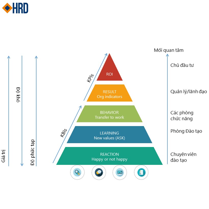 - Cấp độ 5 - ROI: đo lường hiệu quả từ 1 đồng vốn đầu tư cho đào tạo. Mặc dù cấp độ này đòi hỏi rất nhiều điều kiện nhưng nó cũng giúp thỏa mãn trăn trở của khách hàng quan trọng nhất của đào tạo - chủ đầu tư.