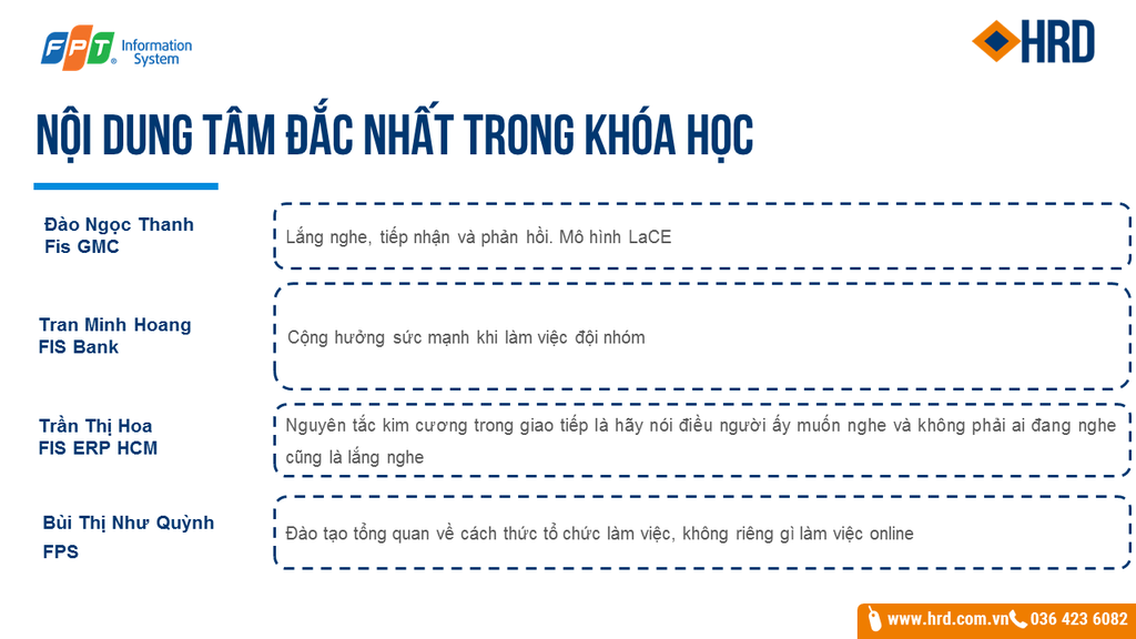 Kết thúc khóa học chị Trần Thị Hoa - FIS ERP HCM đã chia sẻ: "Điều tôi tâm đắc nhất ở khóa học là Nguyên tắc kim cương trong giao tiếp là hãy nói điều người ấy muốn nghe và không phải ai đang nghe cũng là lắng nghe. Tôi mong muốn các tình huống thực tế cùng thời gian thảo luận được đưa vào nhiều hơn trong khóa học này. FIS hy vọng sẽ có thêm cơ hội cộng tác với HRD Academy".