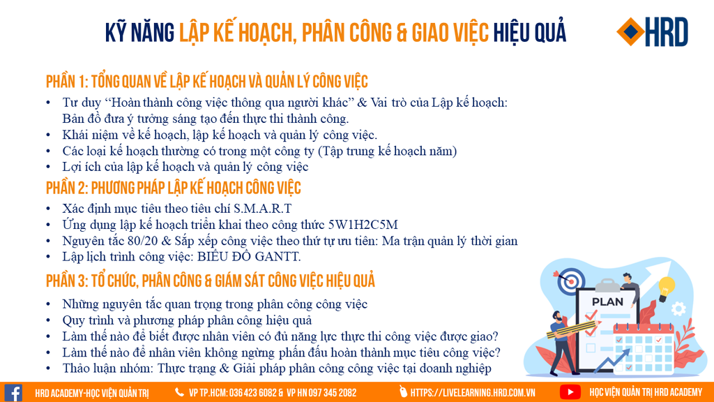 Khung nội dung chương trình đào tạo "Kỹ năng lập kế hoạch, phân công & giao việc hiệu quả" tại HRD Academy