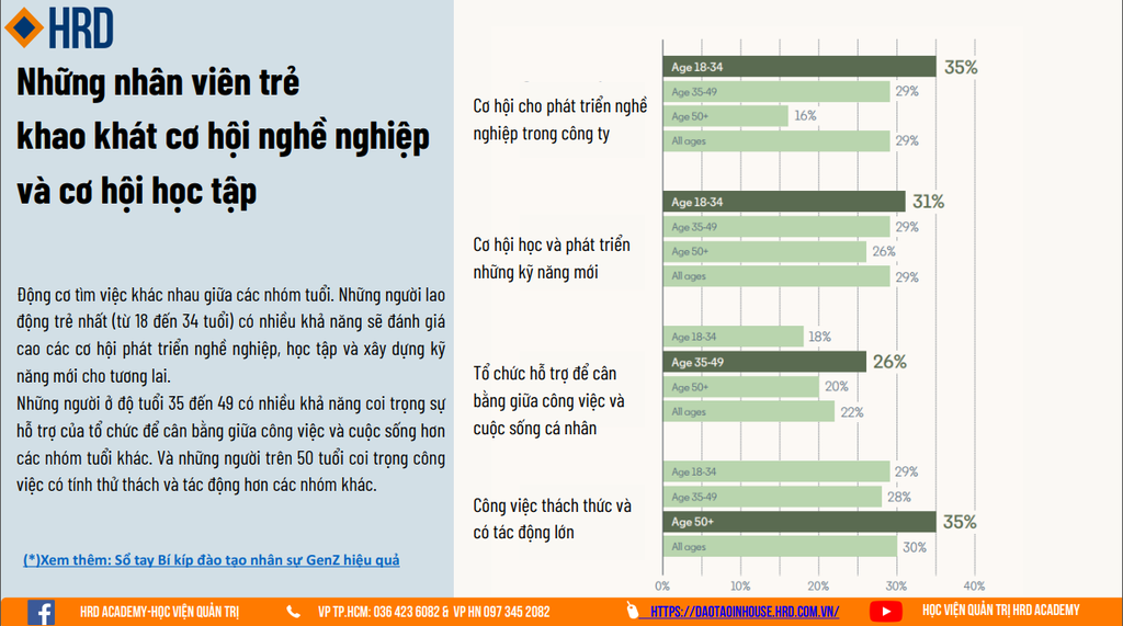 Những người lao động trẻ nhất (từ 18 đến 34 tuổi) có nhiều khả năng sẽ đánh giá cao các cơ hội phát triển nghề nghiệp, học tập và xây dựng kỹ năng mới cho tương lai. Những người ở độ tuổi 35 đến 49 có nhiều khả năng coi trọng sự hỗ trợ của tổ chức để cân bằng giữa công việc và cuộc sống hơn các nhóm tuổi khác. Và những người trên 50 tuổi coi trọng công việc có tính thử thách và tác động hơn các nhóm khác.