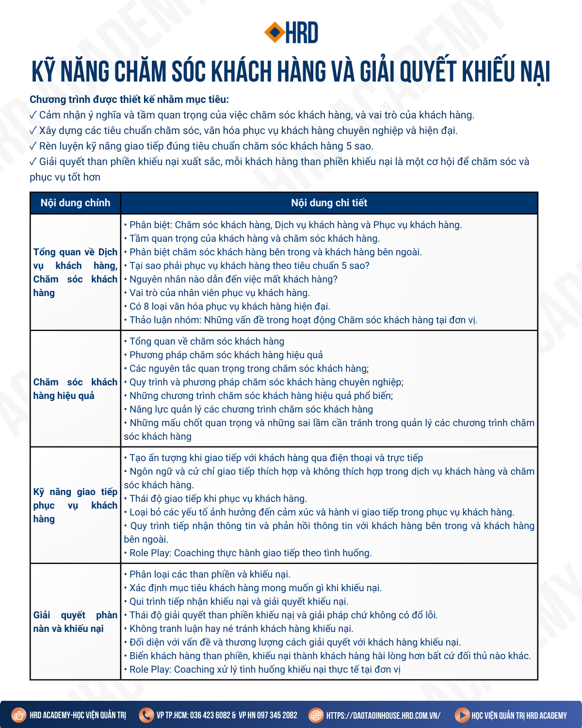 Nằm trong chuỗi giải pháp Nâng cao chất lượng dịch vụ & Hiệu quả bán hàng do Học viện Quản trị HRD Academy thiết kế cho nhiều Doanh nghiệp, khóa học Inhouse “Kỹ năng Chăm sóc khách hàng & Giải quyết khiếu nại” sẽ trang bị kiến thức hệ thống & kinh nghiệm thực chiến nhất dành cho đối tượng cán bộ kinh doanh & chăm sóc khách hàng tại đơn vị