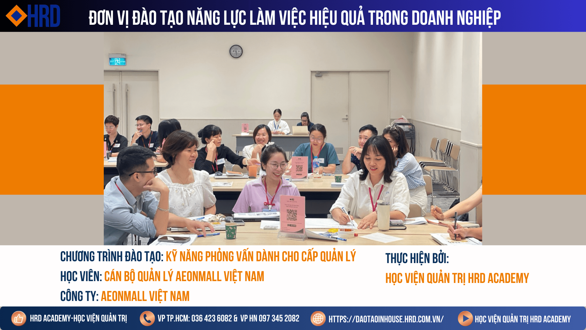 Cảm ơn quý đối tác đã tin tưởng lựa chọn HRD Academy để cùng đồng hành trong quá trình Đào tạo và Phát triển năng lực tổ chức! Chúc cho các Anh/chị cán bộ nhân viên AEONMALL Việt Nam sẽ đạt được nhiều kết quả tốt đẹp nhờ những kiến thức được truyền tải trong chương trình.