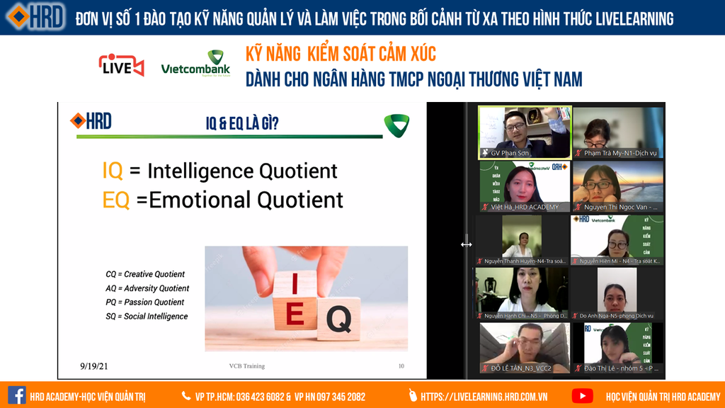 Học viện Quản trị HRD Academy cùng Trường Đào tạo & Phát triển nguồn nhân lực Vietcombank tổ chức khóa học “Kỹ năng kiểm soát cảm xúc” dành cho Trung tâm hỗ trợ khách hàng- Ngân hàng Vietcombank với 4 nội dung chính: