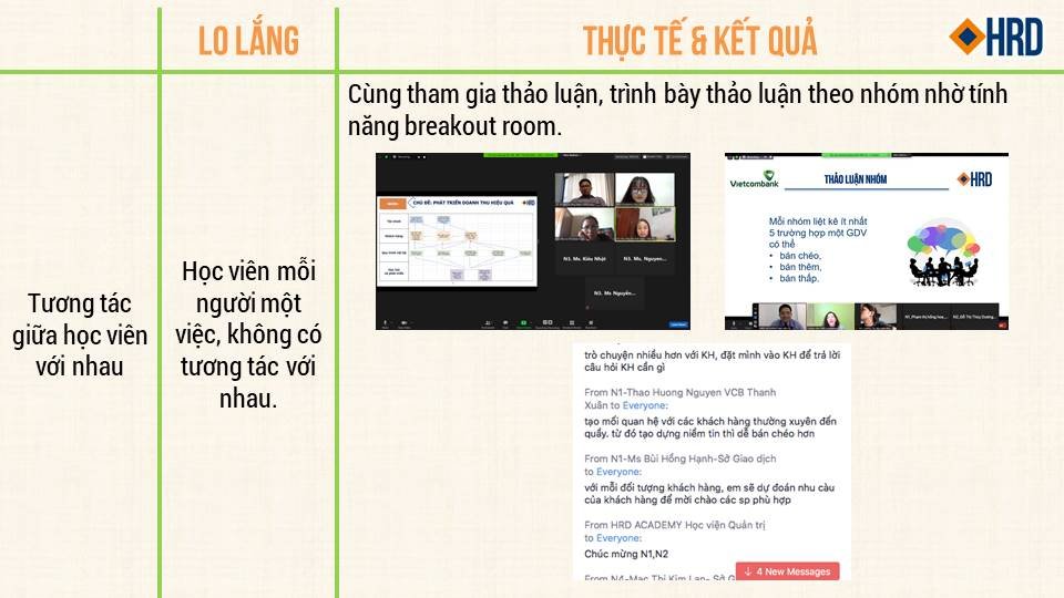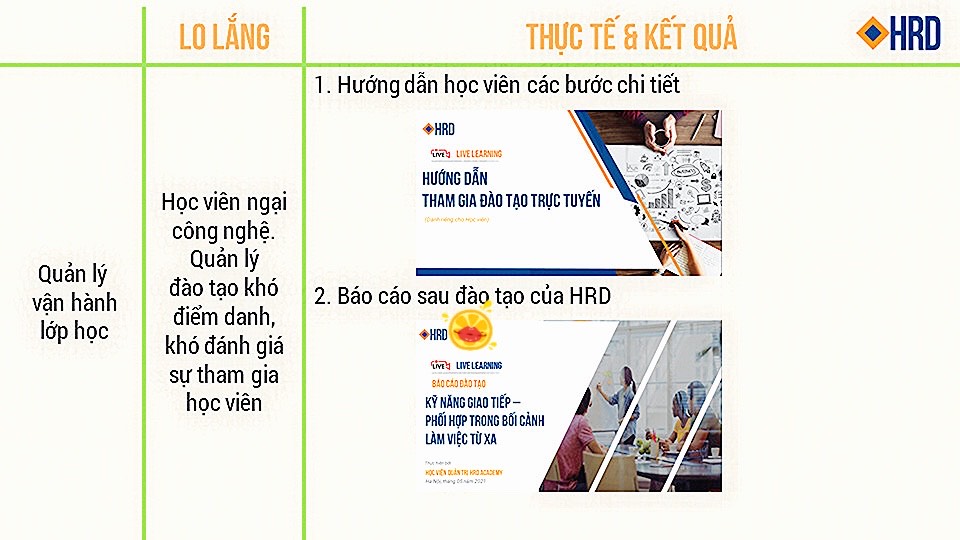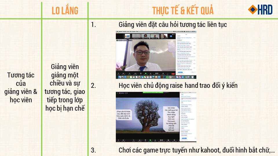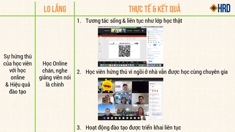 Xu thế đào tạo trực tuyến đang rất phổ biến gần đây, trong tình hình dịch bệnh như thế này. Nhưng với những đơn vị chưa bao giờ hoặc ít tổ chức đào tạo trực tuyến thường sẽ lo lắng về những vấn đề sau. Cùng xem thực tế những lo lắng này được giải quyết như thế nào tại lớp học Live- Learning của HRD nhé!