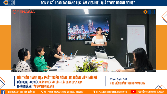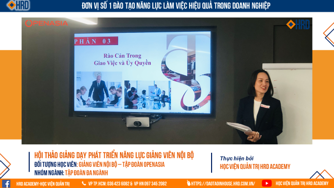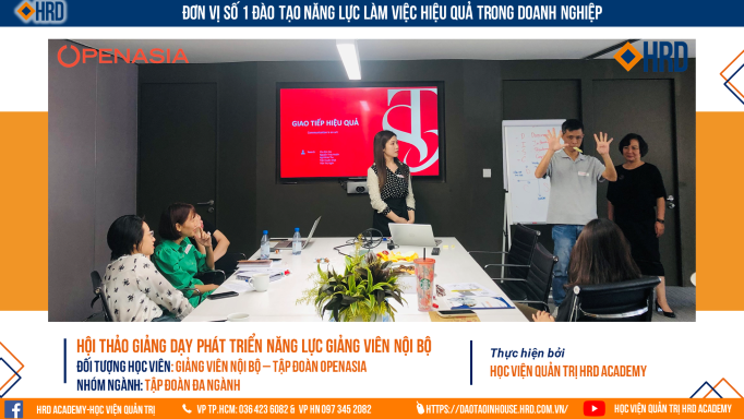 Ngay khi kết thúc chương trình đào tạo “Phát triển năng lực giảng viên nội bộ” kéo dài 3 ngày do Học viên quản trị HRD thiết kế dành riêng cho Tập đoàn Openasia thì các anh chị học viên đã hiểu rõ hơn về chân dung của một Giảng viên nội bộ cũng như nắm bắt được các kỹ năng, phương pháp đào tạo hiệu quả và chuyên nghiệp.