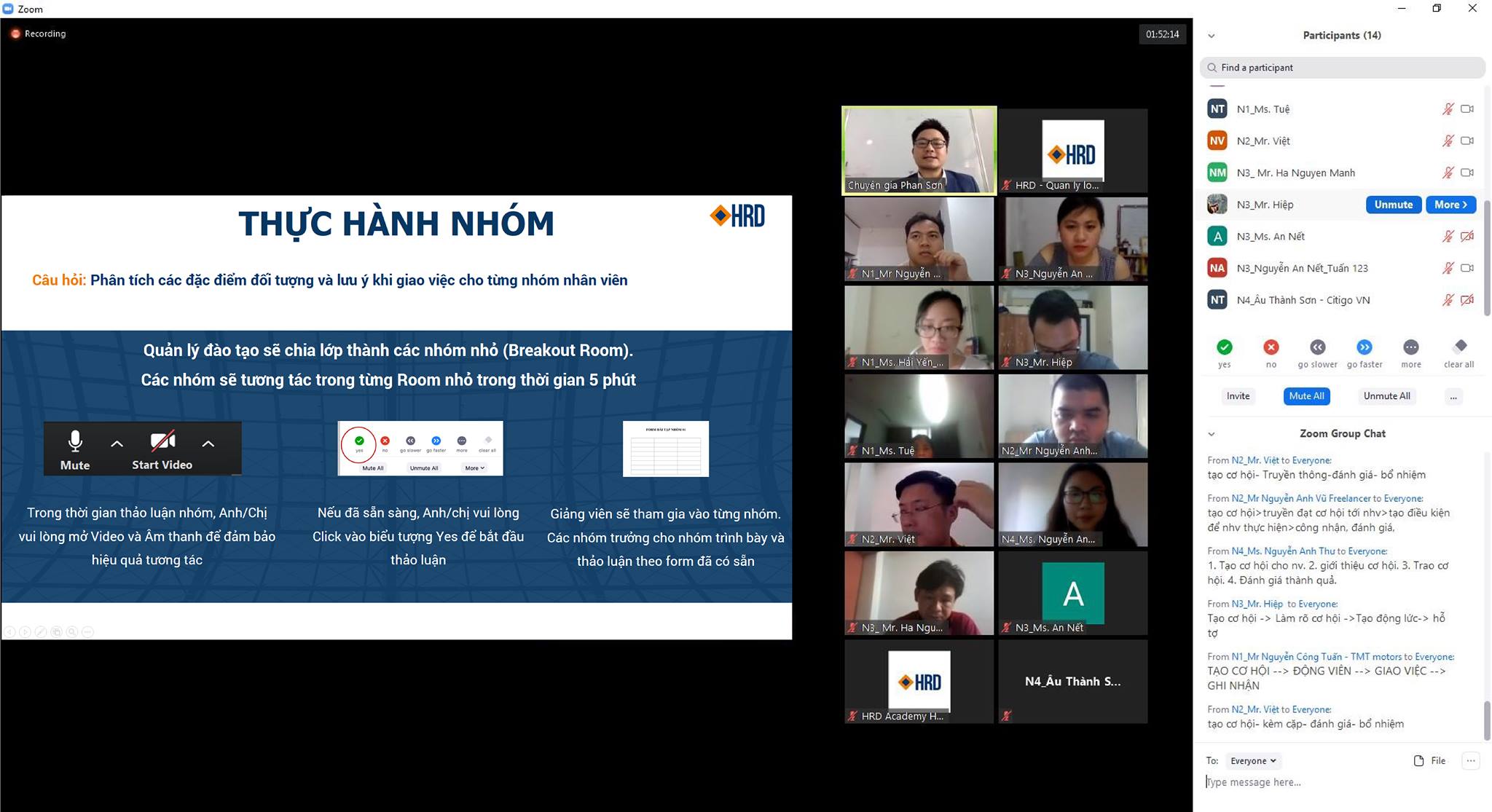 Dưới sự dẫn dắt của chuyên gia Phan Sơn - Chuyên gia trưởng Học viện Quản trị HRD Academy, các học viên đã được tiếp cận và thay đổi tư duy về vai trò của cấp quản lý trong công ty đồng thời trang bị các kỹ năng, công cụ & các form mẫu cần thiết của một nhà quản lý. Các hoạt động huấn luyện thiết kế chuyên biệt qua hình thức đào tạo trực tuyến liên tục suốt 4 buổi học vừa qua đã giúp các Anh chị Học viên nâng cao hiệu quả quản lý công việc cũng như áp dụng các kỹ năng lãnh đạo để xây dựng đội nhóm phòng ban, hướng tới các mục tiêu doanh nghiệp.