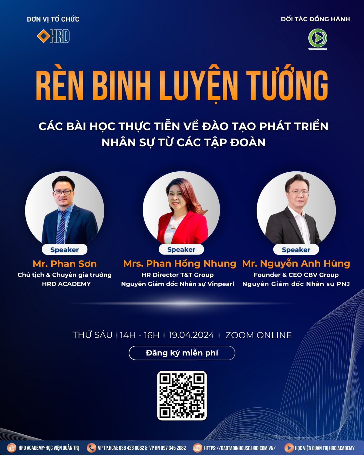Để trả lời các câu hỏi cốt lõi nhất về đào tạo phát triển nhân sự, HRD Academy tổ chức Webinar RÈN BINH LUYỆN TƯỚNG - Các bài học thực tiễn về Đào tạo phát triển nhân sự từ các Tập đoàn, nhằm chia sẻ với các CEO, các nhà Quản lý, các Giám đốc, Trưởng phòng nhân sự đào tạo những nguyên lý, và bài học kinh nghiệm thực tiễn phát triển năng lực đội ngũ hiện tại và kế cận dựa trên các Case Study thực tế tại các Doanh nghiệp hàng đầu.
