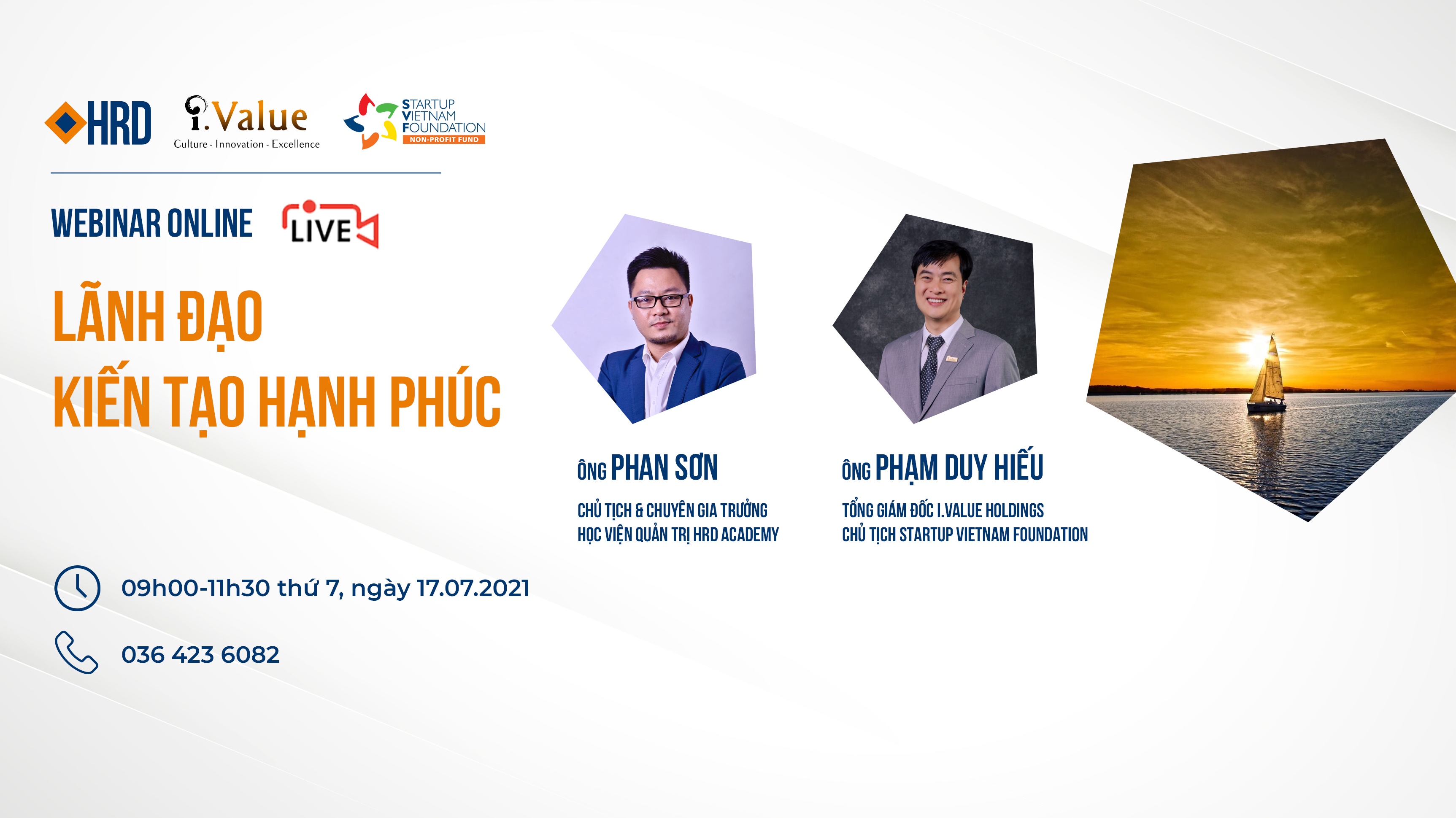 Với kinh nghiệm đồng hành tư vấn & đào tạo cho rất nhiều nhà lãnh đạo & quản lý cấp cao của các tổ chức hàng đầu tại Việt Nam, Học viện Quản trị HRD Academy, i.Value Holdings & Quỹ Khởi nghiệp Doanh nghiệp Khoa học và Công nghệ Việt Nam Startup Vietnam Foundation (SVF) phối hợp tổ chức Workshop Online “LÃNH ĐẠO KIẾN TẠO HẠNH PHÚC” nhằm giúp các nhà lãnh đạo doanh nghiệp thiết kế & kiến tạo những tổ chức hạnh phúc, văn minh & lớn mạnh tại Việt Nam. Thông tin sự kiện:
