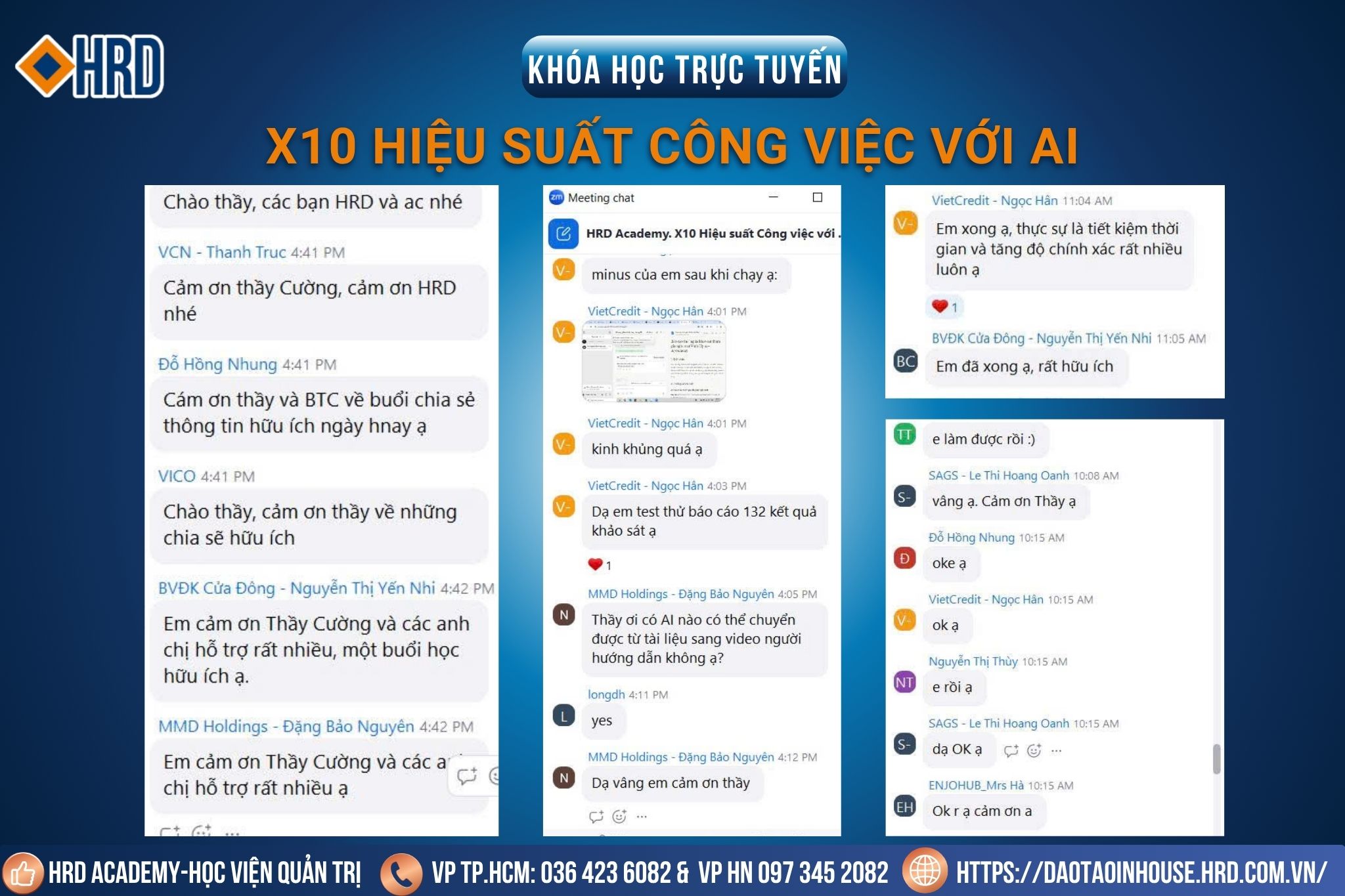 Không khí lớp học đầy năng lượng, tương tác liên tục, dù là học online nhưng không thiếu tiếng cười, sự bất ngờ và cả những “WOW” trước các công cụ AI mạnh mẽ! Một ngày học đậm tính thực tiễn, đầy cảm hứng và mở ra nhiều ý tưởng mới cho công việc Nhân sự, Đào tạo và Văn phòng!